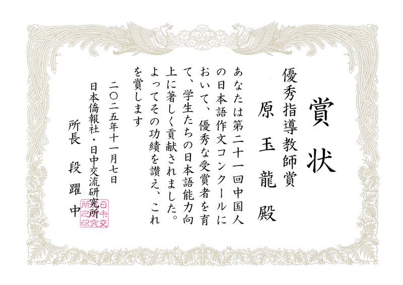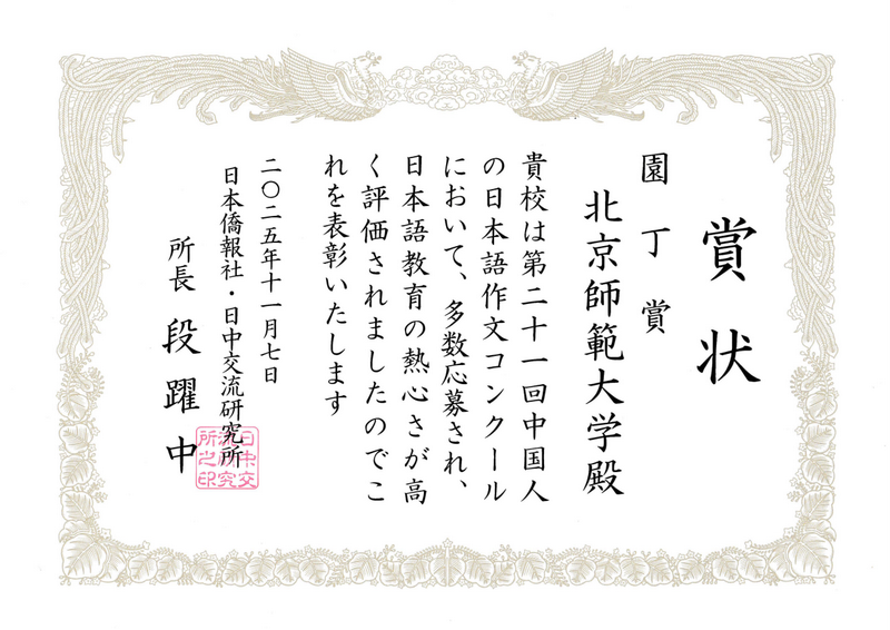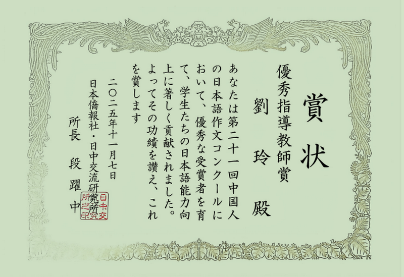 刘玲教授、原玉龙老师指导的日文系2022级张天烁同学的作文《遵从内心的选择》斩获二等奖,2022级傅紫瀛、王子涵和2023级王易祺、刘奕晨同学荣获佳作奖。刘玲教授、原玉龙老师荣获“优秀指导教师奖”,日文系全体教师在本次比赛中为参赛同学提供了全方位的支持,北京师范大学荣获“园丁奖”。