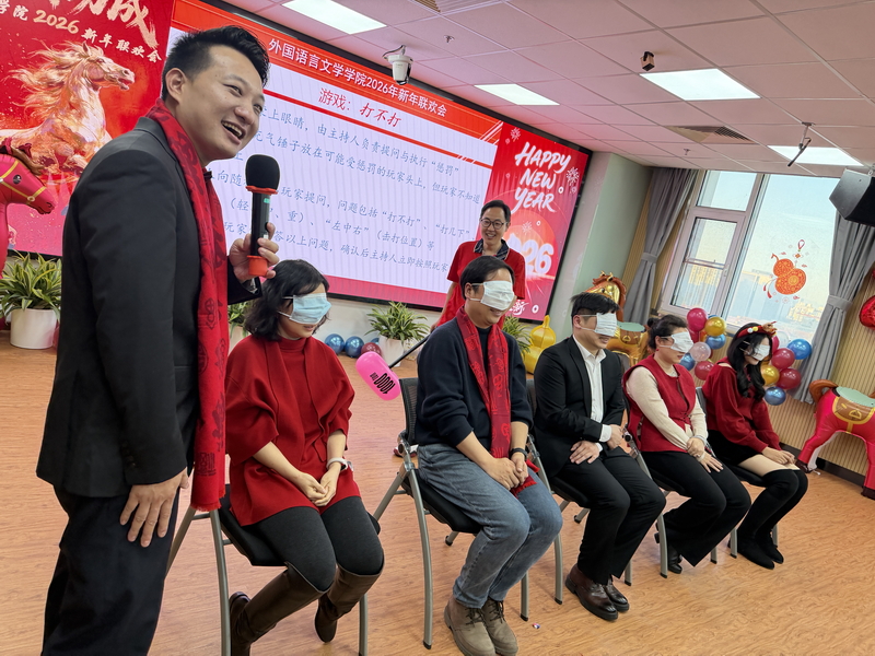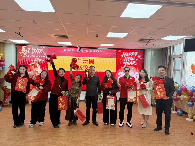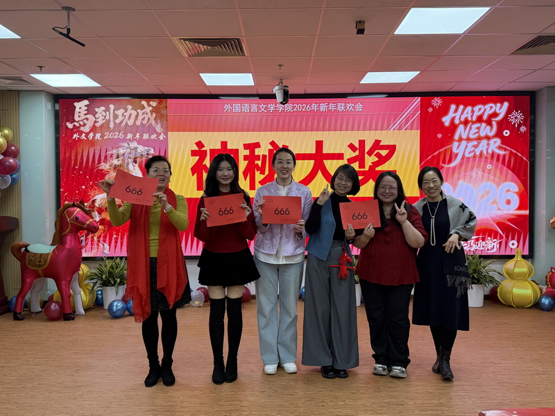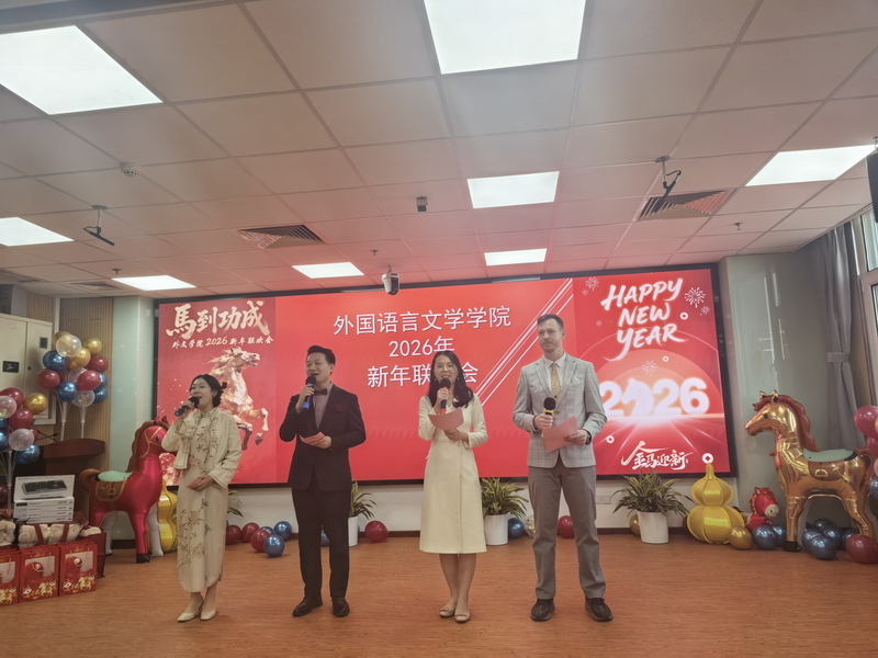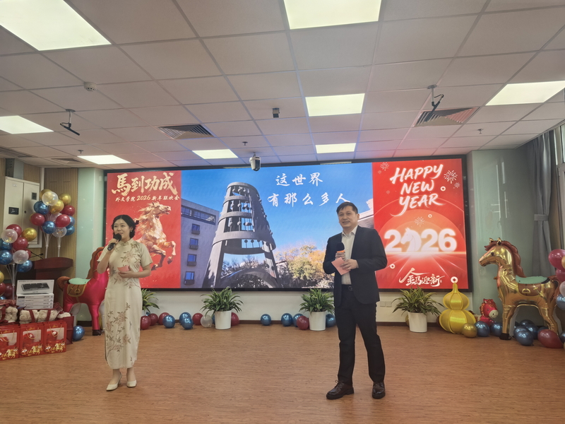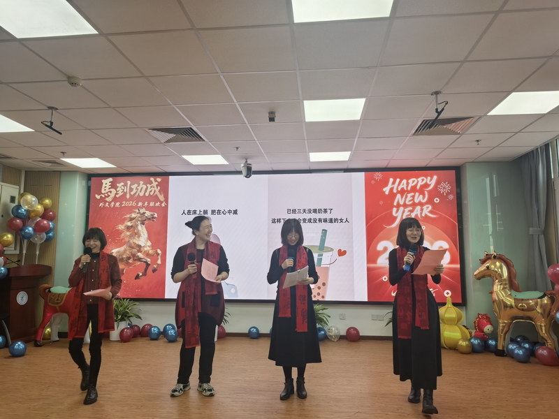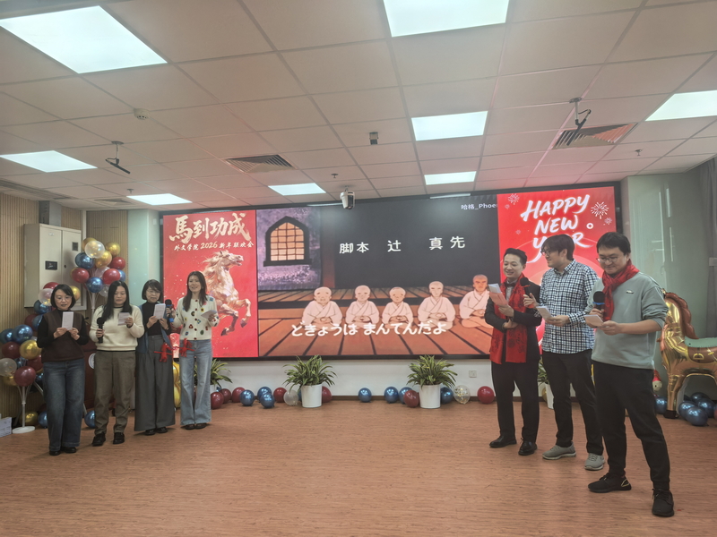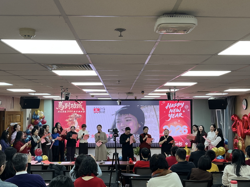 岁序常易,新元肇启。在 2026 年马年新春即将到来之际,外国语言文学学院新年联欢会于2026年1月21日下午3:30在后主楼914学院活动中心温情启幕。全院教师欢聚一堂,用多元的表演、热烈的互动与温暖的陪伴,共同迎接丙午马年的到来。